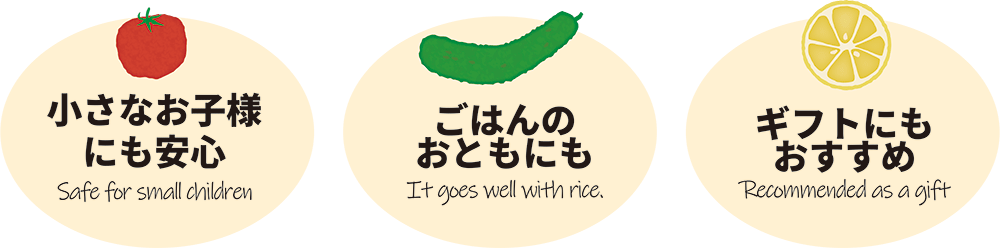旬の野菜を砂糖、塩、お酢だけで、ていねいに漬け込みました。 保存料、着色料などの添加物は一切不使用。野菜そのままのシャキッとした食感、優しい甘酸っぱさが自慢です!